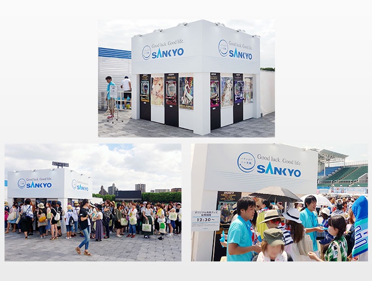 本イベントでは、夏の渋谷で7日間、テーマ毎に日替わりの公演をお送りする「a-nation island」と、大阪と東京で豪華ヘッドライナーの競演を実現する「a-nation stadium fes.」の2つのフェスティバルが開催され、当社は「a-nation stadium fes.」にブース出展し、オリジナル冷却グッズ(携帯用マイクロミスト・クールスカーフ)の無料配布やパチンコ機の展示を行いました。