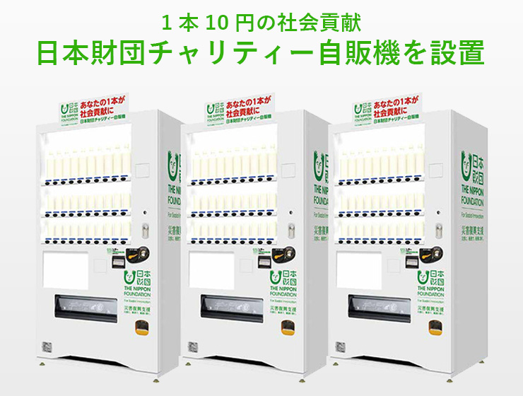 2022年1月21日(金)に日本財団チャリティー自販機を三和工場に3台設置しました。チャリティー自販機は、購入した飲料1本につき10円が寄付される仕組みとなっています。
