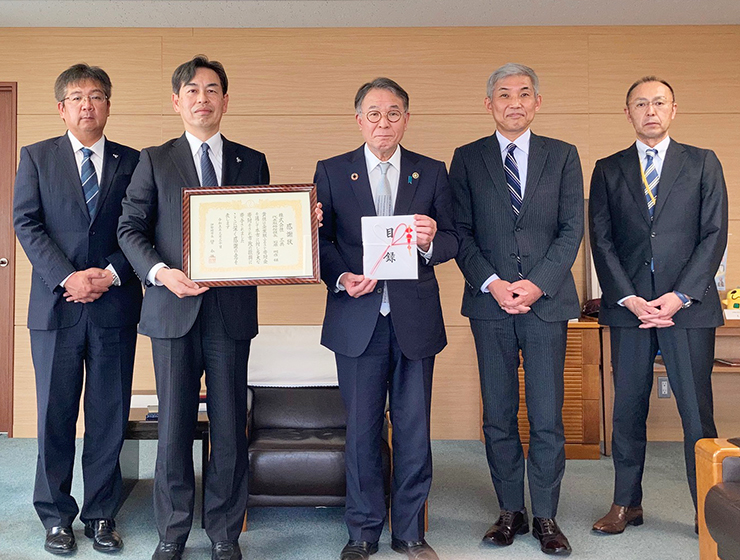 3月30日(木)に行われた感謝状贈呈式には、SANKYOを代表して常務執行役員の高井克昌が参加し、臂泰雄市長から感謝状を受け取りました。